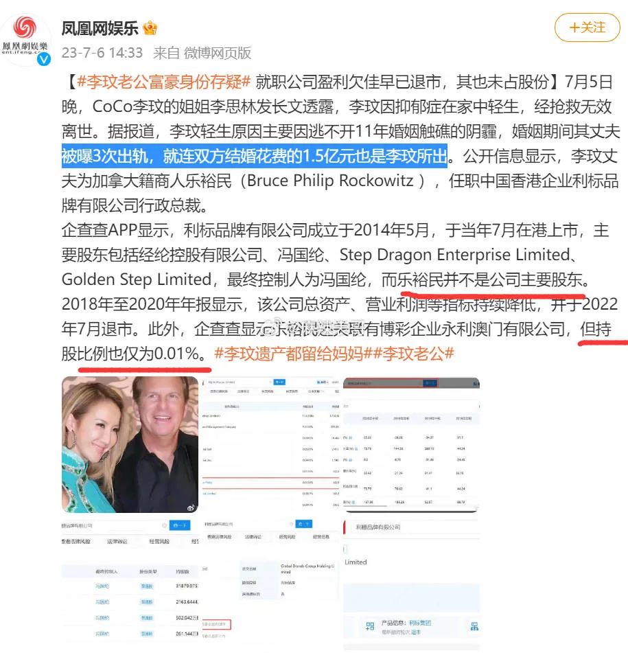 他靠李玟的人脉,成为利标品牌公司的行政总裁,并不是公司的主要股东,持股比例只有0.01%。