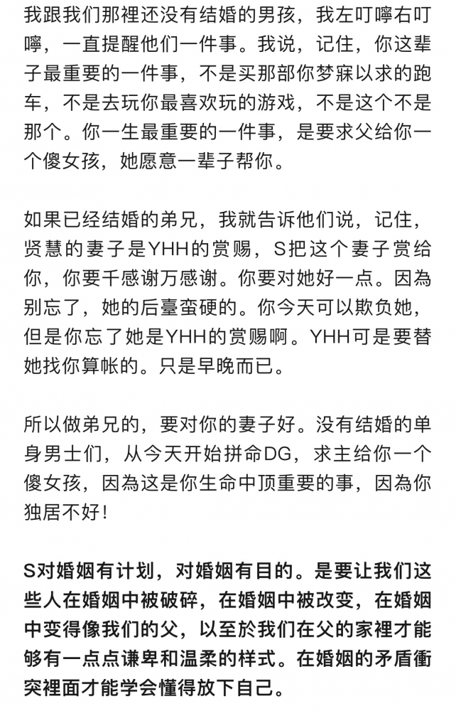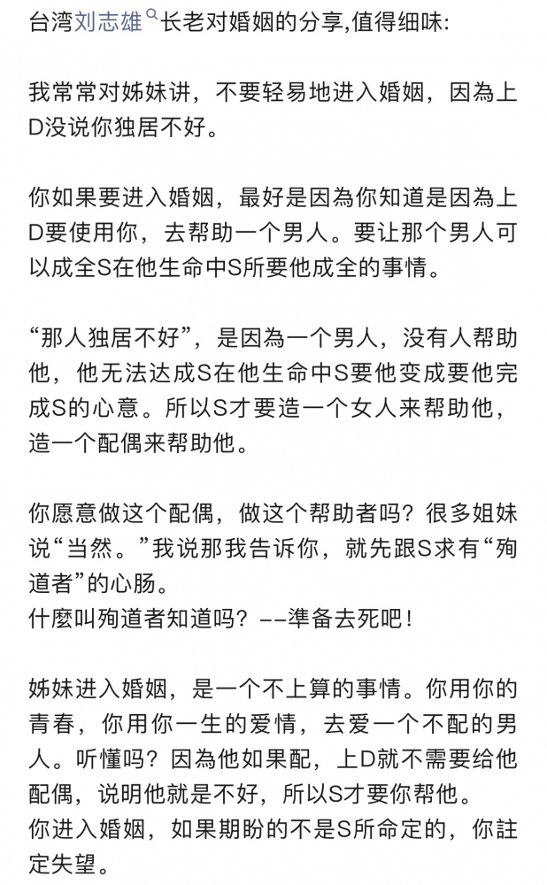更新了一条心情: 若没有使命感,不要轻易进入婚姻。你如果要进入婚姻,最好是因為你知道是因為上D要使用你,去帮助一个男人。要让那个男人可以成全S在他生命中S所要他成全的事情。 “那人独居不好”,是因為一个男人,没有人帮助他,他无法达成S在他生命中S要他变成要他完成S的心意。所以S才要造一个女人来帮助他,造一个配偶来帮助他。 全文