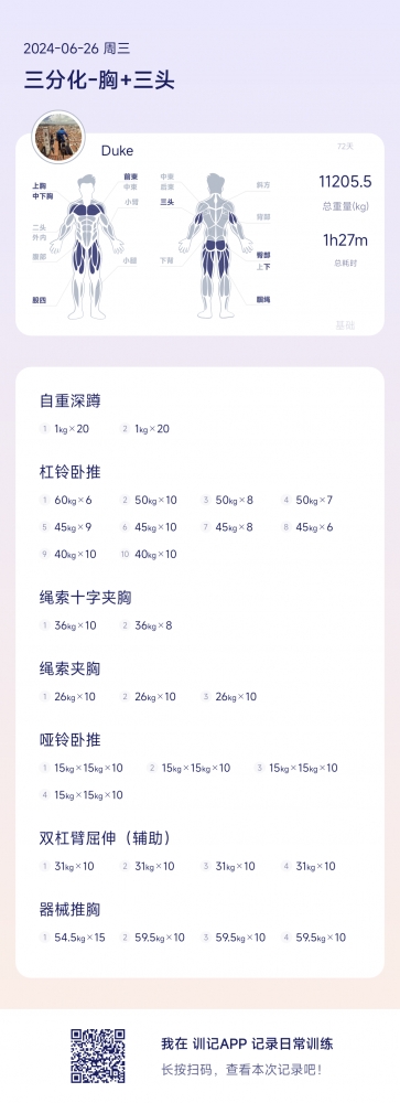 我从二月下旬开始力量分化训练,每周4-5次,差不多四个月了,体重减了20斤,衣服小了两个码,今天冲击平板卧推60KG成功,做了1组6个。以后还要继续坚持锻炼,让自己为了以后能照顾我爱的和爱我的人,而努力变得越来越好!
