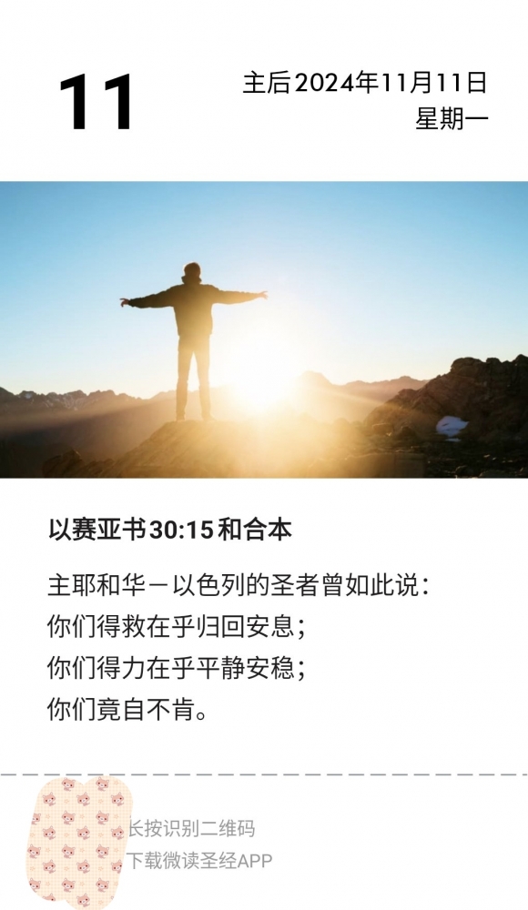 更新了一条心情: 周一背诵经文:神是我们的避难所,是我们的力量,是我们在患难中随时的帮助! 诗篇46篇第1节 全文