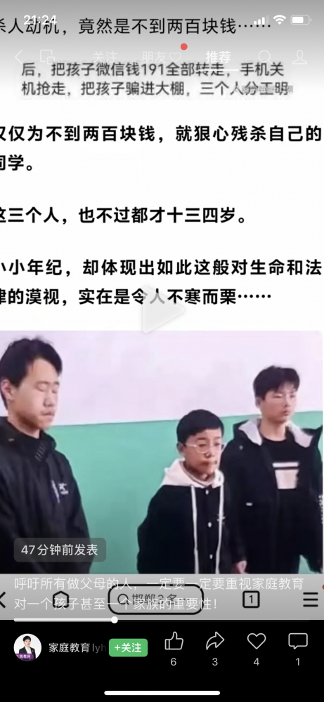 更新了一条心情: 这三个初中生,把自己同学拿铁锹,活活打死,脸头戳的面目全非,~~对于被欺负的永远都是老实内向的孩子,这样的孩子也不会表达,也不会跟任何人说,从来都不知道需要报警,根本不知道怎么面对这个问题,关注内向听话乖巧的孩子,这样的孩子最容易被别人侮辱和欺压…… 全文