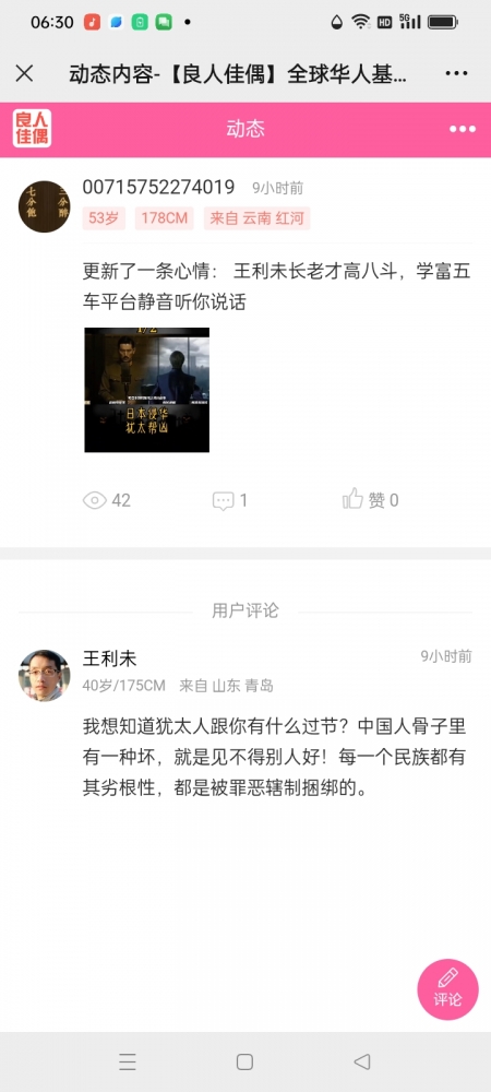 更新了一条心情: 狗不嫌家贫,儿不言母丑。一个人不爱自己的国家民族而为了千万里之外的客户代言。请问王利未长老:为什么抗日战争中有汉奸卖国贼?你是犹太人以色列的水军吗?是犹太人埋在孔孟之乡的一枚地雷吗 全文