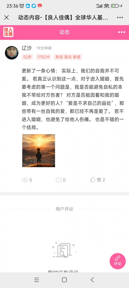 更新了一条心情: 实际上,我们的自我并不可爱。 若真正认识到这一点,对于进入婚姻,首先要考虑的第一个问题是,我是否能避免自私的本我不带给对方伤害? 对方是否能因着和我的婚姻,成为更好的人? “爱是不求自己的益处” ,那些带有一丝自我的爱,都已经不再是爱了。 若不进入婚姻,也避免了给他人伤痛。 也是不错的一个结局。 全文