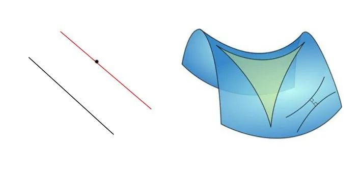 在平面几何中,认为过直线外一点,只能作出一条直线与已知直线平行;但在非欧几何中,却有无数条。