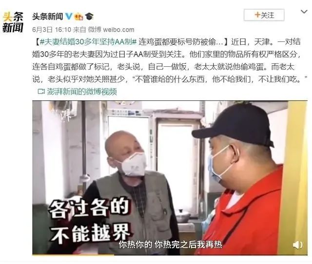 前几天看到一个新闻,说天津的一对老夫妻,坚持AA制30多年。