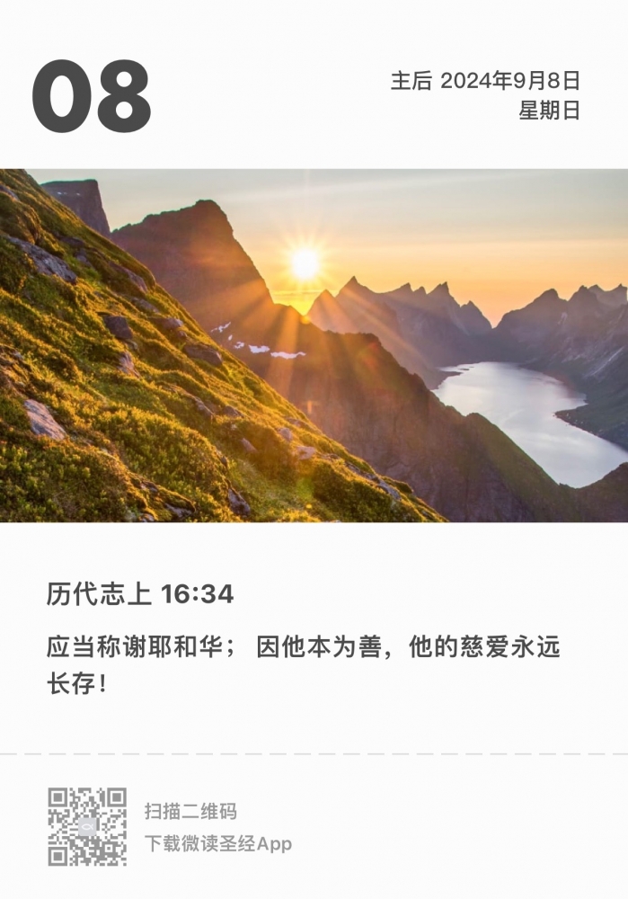 更新了一条心情: 九月九号周一金句 创世纪13章1-2节; 亚伯兰带着他的妻子与罗得,并一切所有的,都从埃及上南地去。 亚伯兰的金、银、牲畜极多。 全文